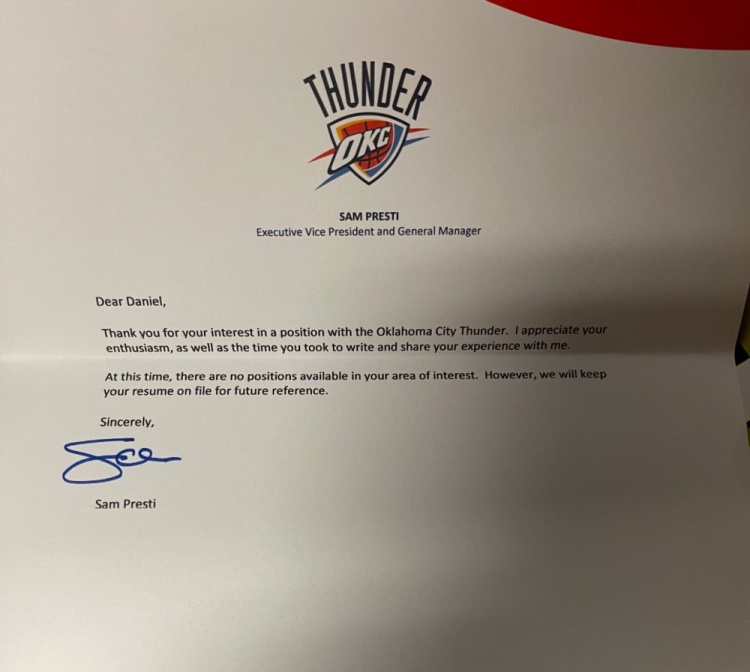 签名信中写道:“亲爱的丹尼尔,谢谢你对我们球队内部职位的兴趣,我很感谢你的热情。你能花时间给我们写求职信,我很感谢你能这么做。与此同时我很遗憾地告诉你,现在没有符合你兴趣的职位,尽管如此,我们会保留你的简历以备以后需要。”
