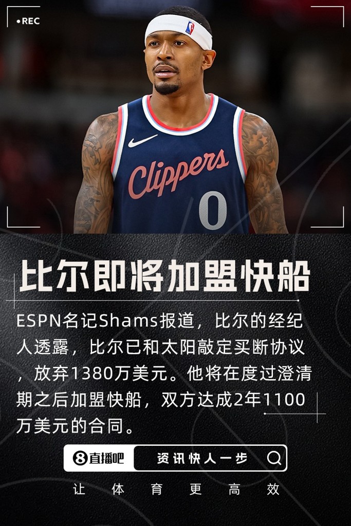 Shams Charania表示,比尔和快船达成了一份2年1100万美元的合同。
