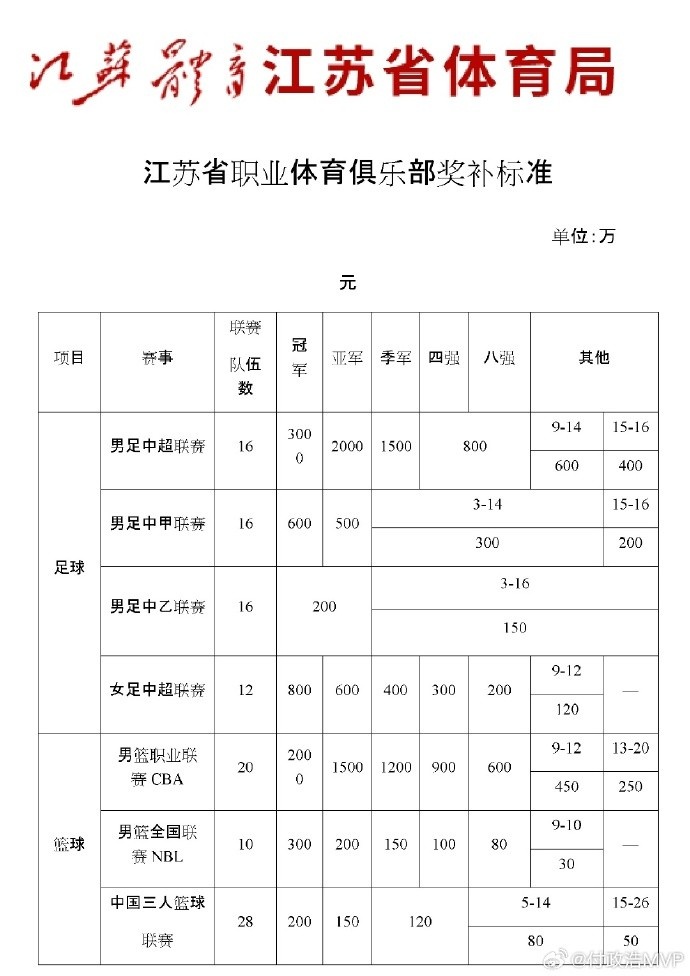 江苏喊本省的职业体育俱乐部领奖补了!近日,江苏省体育局发文安排省内各职业体育部申报江苏省体育事业发展专项资金(职业体育俱乐部发展)奖补资金,主要按照上一年成绩来奖励。比如,江苏省对夺得中超冠军的俱乐部奖励3000万,但遗憾的是,江苏目前没有中超俱乐部;对CBA冠军队奖励2000万,江苏目前有两家CBA俱乐部,南京同曦上赛季是第12名,江苏肯帝亚男蓝是第20名,按照江苏省体育局的奖补标准,同曦能从省体育局层面申领到450万,肯帝亚能申领到250万元。