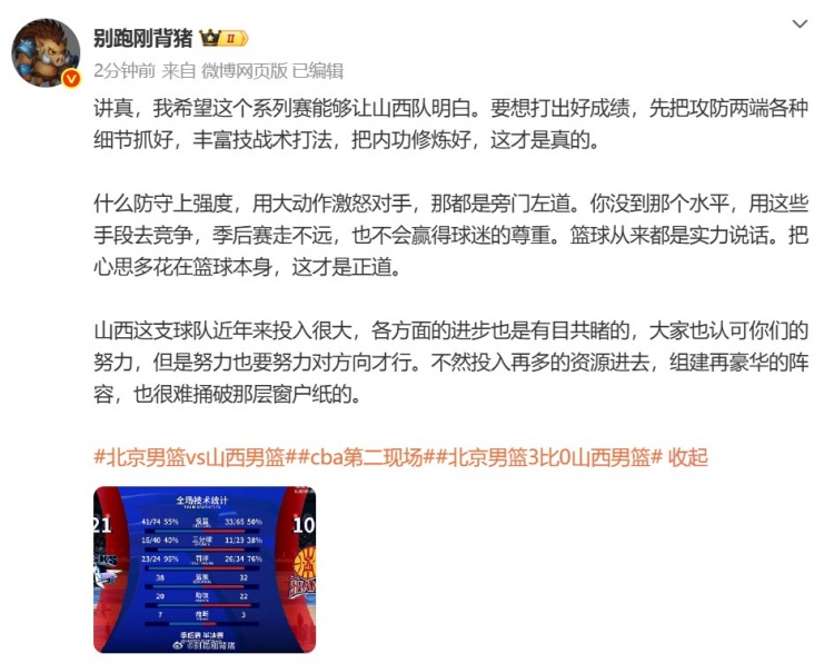 赛后,媒体人@别跑刚背猪发文谈到了山西男篮,内容如下: