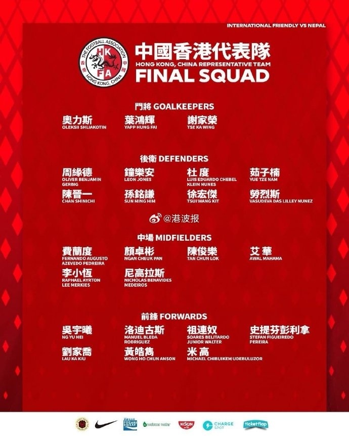 中国香港队友谊赛对阵尼泊尔大名单