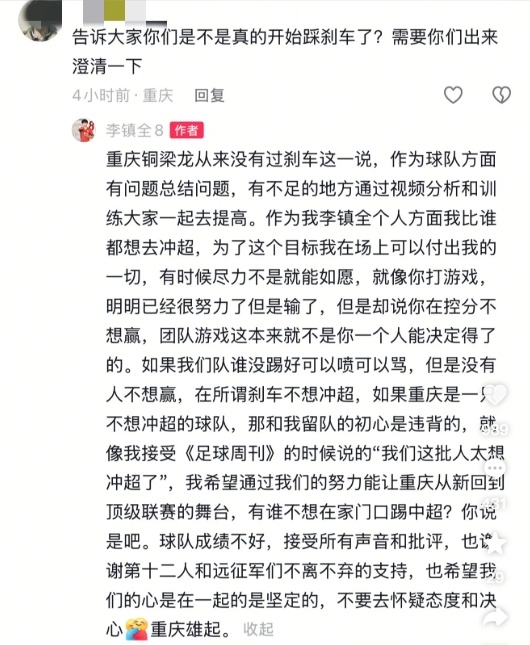 06月22日讯 中甲第13轮,重庆铜梁龙1-3不敌石家庄功夫,近期联赛3平1负。赛后21岁的重庆铜梁龙中场李镇全回复了网友的评论。
