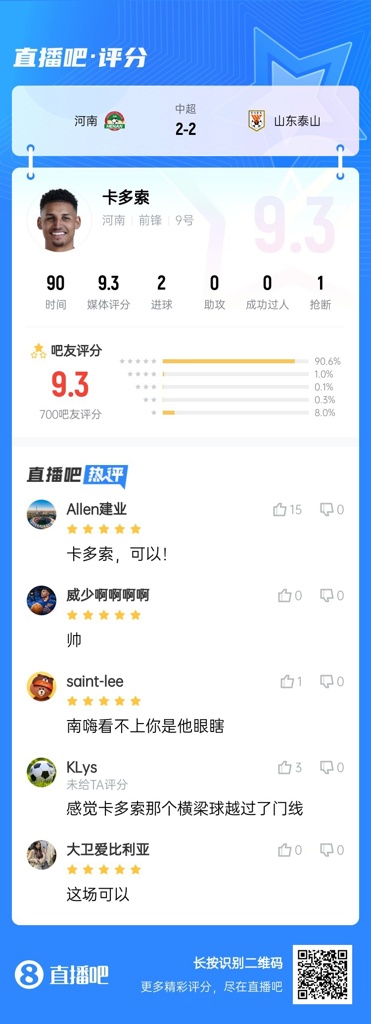 【】中超第四轮最佳球员:基莱斯当选,为了天津永远进攻!