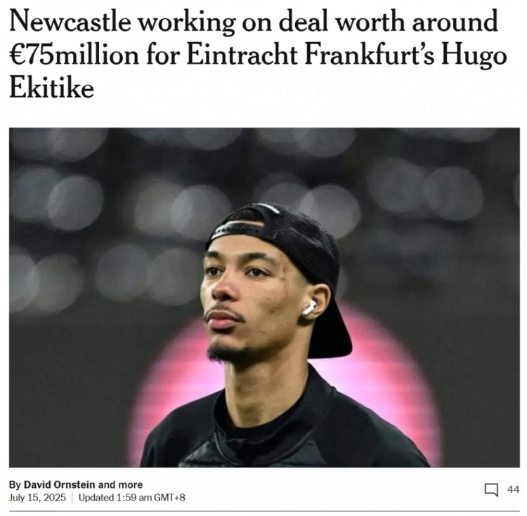 7月15日讯 TA记者奥恩斯坦的报道,纽卡正致力于从法兰克福签下前锋埃基蒂克,这笔交易价值约为7500万欧。