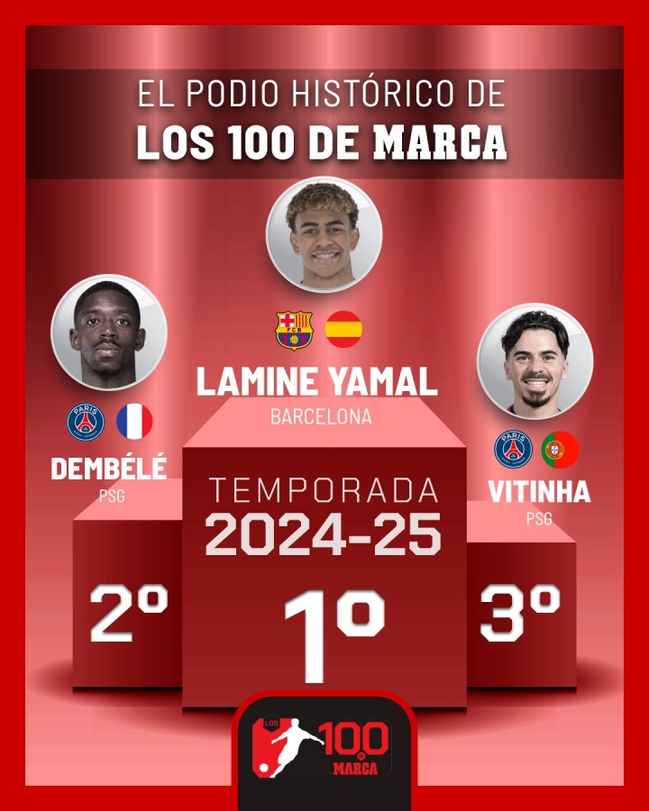 马卡表示,100人的候选名单在世俱杯开打前就已确定,并开启投票,不过很多评委在世俱杯期间或赛事结束后才提交投票。虽然亚马尔缺席世俱杯,但仍以210分的优势击败了进入决赛的登贝莱。