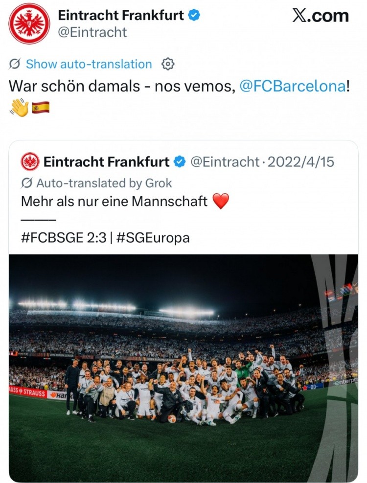 在抽签出炉后,法兰克福官推转发了22年4月,球队在欧联杯1/4决赛次回合客场3-2击败巴萨晋级下一轮的赛后球队合影庆祝胜利的社媒,并配文写道:“那是一段美妙的经历,期待我们的再次相见,巴萨!”
