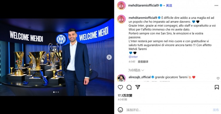 “国际米兰将永远留在我心中。带着感激之情,我向你们所有人告别,并祝愿你们未来赢得更多荣誉!满怀感情地这么做。——梅赫迪-塔雷米。”