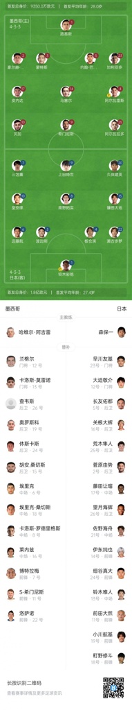 09月07日讯 足球友谊赛,墨西哥vs日本。赛前双方的首发阵容出炉。