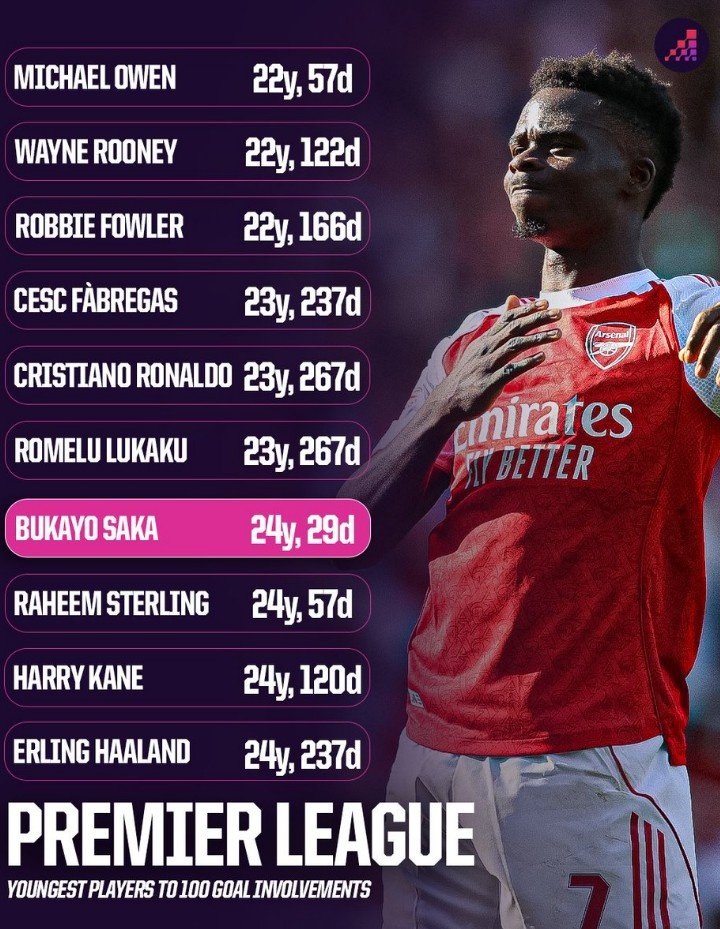 以下为英超历史达成直接参与100球最年轻纪录榜,萨卡位列第7。